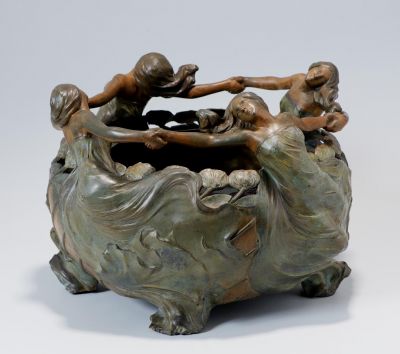 The hemispherical bowl of a rich, floral decoration stands on four, leaf-shaped feet in relief. Four dancing female figures rise in relief from the flowers around the top rim, dressed in loose clothing, holding each other's hands.