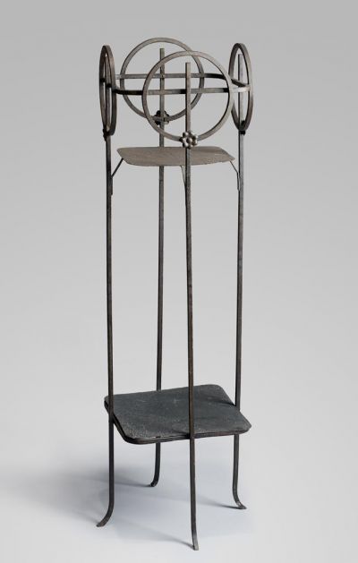 The stand is supported by four legs that are slightly curved at the bottom. There are two square shelves of different size between the legs. A square stretcher connects the legs at the top, connected to a ring on each side. The juncture of the rings and the legs is enriched with a small, embossed, stylized flower. Ede Thoroczkai Wigand designed this flower stand in Marosvásárhely, for the Peremartoni family (according to the information of the former owner).