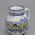 The egg-shaped, fluted bowl stands on a base with a narrow rim and ends in a short cylindrical neck. There is a curving handle. The top and the bottom of the bowl are decorated with double blue lines. The neck has pearl motifs the belly shows flowers and foliage, enclosed by lace decoration. There is an inscription under the neck: PETRVS: VYFALVSY:, and the date 1666. Painted in blue, green and yellow, contoured and shaded in manganese, on a white background.