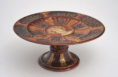 Techniques: | embossed decoration; lustered glaze; painted with polychrome glazes |