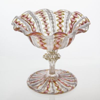 The broad foot rises conically in the middle, supporting the baluster-like, ribbed stem, which is decorated with glass thread applied and frilled while hot, and also with gold foil grains. The bowl forms a flower petal, with splaying, frilled rim. The foot and the body are decorated with alternating stripes in vetro a retorti technique, enriched with lace-like motifs and opaque, white, pink and copper aventurine glass threads. Both the form and the decoration of this object are based on the traditions of Renaissance glass of Venice-Murano.