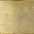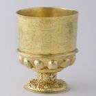 The round base and the cylindrical stem are decorated with masks. The bottom of the flat hemispherical bowl is chased, the cylindrical upper part is engraved with three scenes from the Old Testament: The sacrifice of Abraham, Joshuah and Jacob, The daughters of Lot.