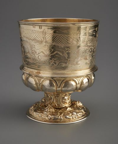 The form is identical with that of Cat.No. 166. The upper part of the bowl is engraved with a boar-hunting scene and many figures. The picture shows stylistic features of the minor German Renaissance masters, with no exact model known. The piece described above was probably one of ten cups which could be inserted into each other. Marked.