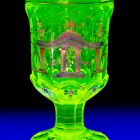 The foot is faceted into eight sides, holding a short stem and a flower-shaped cup that is faceted at the bottom and pared on the sides. Each side of the foot shows a gilt flower, painted in pink, blue, green, red and white opaque. The cup has identical motifs of similar technique, surmounted by a picture of a Classicist-style garden pavilion with flower vases, among stylised foliage and flowers. The other picture depicts a heart framed by rays in the middle of a flower wreath. The piece described above required high technological knowledge, representing the rich decoration of Biedermeier, while in its painting approaching neo-Rococo or neo-Classical trends.