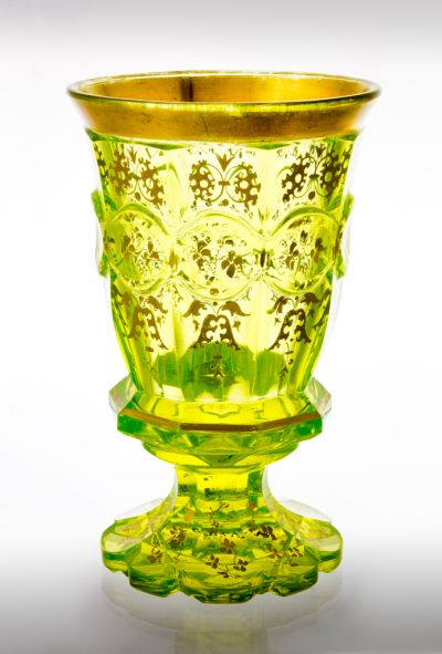 Techniques: | blown; carved; faceted to planes; gilded; ground; painted in gold |
