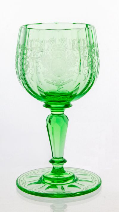 The broad foot supports a stem with discs, faceted into eight sides, on which the hemispherical cup of twelve faceted sides stands. The foot is faceted with lines and olives, with carved, geometrical motifs all round. The cup shows carved Baroque and Renaissance motifs: lattice, ribbon, foliage and tendril ornaments, and a coat of arms in a Baroque cartouche. The shape and the greenish colour of the piece recall the early römer glasses of the Rhine-land. It is interesting, that on the other hand, the carved decoration follows the Renaissance- Baroque style of rock crystal pieces.