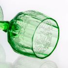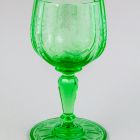 The broad foot supports a stem with discs, faceted into eight sides, on which the hemispherical cup of twelve faceted sides stands. The foot is faceted with lines and olives, with carved, geometrical motifs all round. The cup shows carved Baroque and Renaissance motifs: lattice, ribbon, foliage and tendril ornaments, and a coat of arms in a Baroque cartouche. The shape and the greenish colour of the piece recall the early römer glasses of the Rhine-land. It is interesting, that on the other hand, the carved decoration follows the Renaissance- Baroque style of rock crystal pieces.