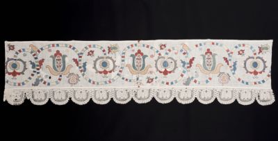 Techniques: | bobbin lace trimming; embrodiered with flat stich |