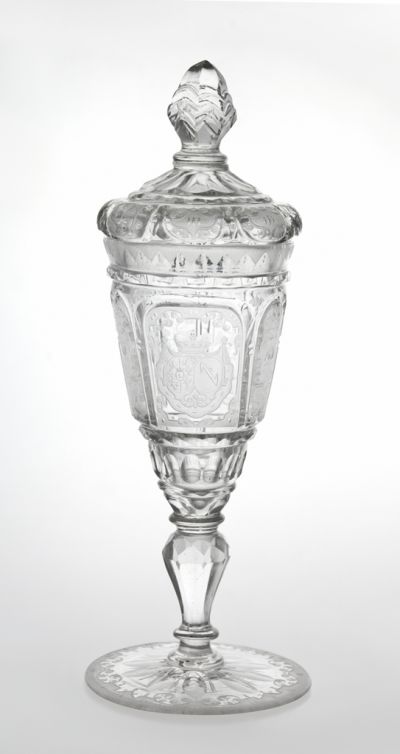 Circular foot, with volutes on the edge, baluster stem, tapering cup divided into fields, closed semi- circularly. The largest of the fields is decorated with the coat-of-arms of the Esterhazy Dukes. In two fields are grape-vines, in the other four ones tiny landscapes in a pattern of scrolls and volutes. On the rim of the goblet is a pointed, cut frieze. It has a cover of two segments with a pattern of scrolls and volutes, and an acorn-shaped, ground finial.
