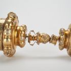 The jointed, round foot is decorated with Neo-Renaissance ornaments imitating etching, surmounted by a broad stripe of blown motifs. The baluster stem is enriched with alternating masks and bunches of fruits. The broad, bulging cup shows two rows of blown motif, with three masks in the top row. The top rim is lined with leaves.