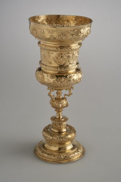 The acorn-shaped bowl stands on a round base, with a stylized vase-shaped node joining it to the stem. It is decorated with rich chased ornaments of mask and flowers these motifs were typical of the etchings made in Germany between 1560 and 1600.