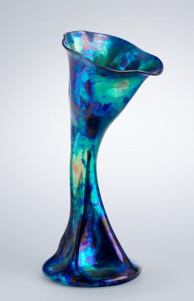 This is a variant of Cat. No. 9.73, in a larger size. The goblet is wheelthrown and spontaneously handshaped from a sand-glass-like, cylindrical body. The round, straight foot supports a softly bent body, creating four dents and four upwardly curving ribs. The twisted neck is surmounted by a wavy cup with five dents and a delicate, splaying, wavy top rim. The glaze is marbled with blue, green and gold, with a slight purple iridescent effect. The Zsolnay collection of the Janus Pannonius Museum has two similar goblets with another glaze patter, Inv.Nos. 51.4816.1 and 51.4852.1. The Zsolnay factory exhibited a whole series of chalices at the 1898 Christmas exhibition. A contemporary critic remarked their about these pieces: "...there are some exhibited pieces without any kind of ornamentation, creating effect only with the intentionally spotted, marbled glaze."