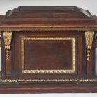 The plinth of the prismatic chest is a corniche with a jointed rim, decorated with a lath of eggs. Each of the four sides shows an embedded, square inlay, framed by lines of leaves. The shorter sides are equipped with a handle with a lion's head. The edges are lined with floral garlands and volutes with acanthus leaves, which appear to support the protruding, jointed top. The top is bordered with a gilt lath of eggs. It can be lifted with four iron rods, sliding in tubes. The chest conceals four small drawers. There is an inscription on a paper, on the bottom of the chest: „Gefertigt bei Johann Frankh Tischler Meister in Gran 1827”. The main characteristics of the chest suggest that Empire style remained popular for a long time. The chest used to belong to the weaver's trade association of Esztergom. It has two original keys.