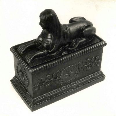 The rectangular plinth is profiled at the bottom, decorated with repousse lines of leaves. The two longer sides show a six-pointed star in a circle, enclosed by string-of-pearls, among rose boughs with flowers and leaves. The two short sides show a female bust in the same string-of-pearl frame. The top corniche has a vertically ribbed protruding rim the detachable top shows the relief figure of a sphinx. The plinth contains two containers for the ink.