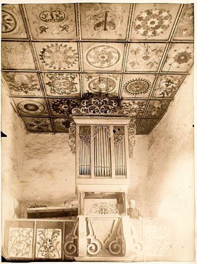 Interior photograph - painted coffered wooden ceiling and the loft of the Calvinista church of Maksa