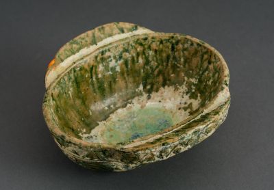 Techniques: | covered with green lead-glaze; hand-shaped; moulded decoration; pressed in mould |