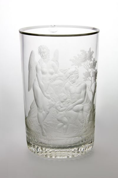 The cylindrical glass is faceted with wedges at the bottom. The front shows a mythological scene: a naked male figure on a grass bench, in a scenery of trees, flowers and plants. He wears a winged helmet and sandals stroking a winged child who holds a chalice in its hand. There is a winged female figure beside, holding a bow and stroking the wing of the child.