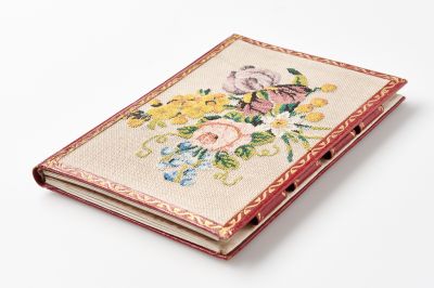 | Materials: | cotton (presumably); cotton thread (presumably); leather binding |