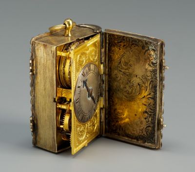 It may be assumed that one of the bills from the 17th century in the National Archives refers to this object: it shows that Pál Esterházy, Palatine (1635—1713) between 20th October, 1690, and 6th February 1691 had payed 300 Florins in three payments to the "imperial watchmaker of Vienna", Albrecht Erb for two watches one of them was a "Büchl mit der Uhr" (OL The Archive of the Ducal Line of the Esterházy Family, P. 125. 48 / 10750). This object is first mentioned in the material of the Esterházy treasury in the inventory of 8th January, 1693.: "Horologium Aureum in forma libelli Tyrkesys Gallicis atque granatis et alys Lapidis ornatum" (OL The Archive of the Ducal Line of the Esterházy Family, Rep. 8. Fasc C. No. 37, NB / 1. p. 18. — the interpretation of Mihaly Detshy). Probably this object is the one referred to in the description of the 1725 inventory of the Esterházy family in Fraknó: — „Egy szarga pántlikán függő kövekkel ki rakott aranyos könyv forma órácska” . "A small watch, book-shaped, set with precious stones, gilt and hanging on a yellow ribbon" (Inventarium Thesauri Fraknensis Anno 1725. Almarium Sub. Nris. 51 et 52. Nro. 11. —The Inventory of the Museum of Applied Arts 236/ 1957). This item of the inventory is published and identified with the object (Héjjné Détári Angéla: A fraknói Esterházy-kincstár a történeti források tükrében. In: Magyarországi reneszánsz és barokk: Művészettörténeti tanulmányok. szerk.: Galavics Géza, Budapest, 1975, 496. p.).