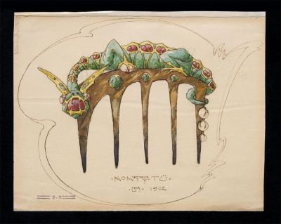 The designs for the knotpin, the pendant, the ring and the tie pin were made at the same time, as parts of a series. The clear lines of the elegant sketches reveal that Darilek was the follower of Viennese Secession patterns “with a light hand”. Among the four, it is the knotpin design that shows the richest fantasy. Creating a knot on the neck or pinning the hair loosely on the top of the head was a popular hairstyle of the turn of the century. This hairpin is decorated with a fantasy dragon figure. Its ceramic body is covered with tiny, colourful precious stones. The setting of the stones is similar on the other pieces that were probably enriched with enamel painting. These sketches were made by Darilek at Pécs, while he was a designer of the Zsolnay factory.