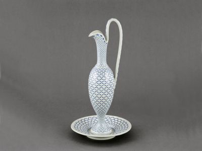 A thin, narrowing foot holds the slim, oval body, which is continued in a high and narrow neck and an upwardly curved spout. The handle starts from the spout, rises up and returns vertically to the shoulder of the jug with a steep curve. The surface is decorated with a beau green, opaque basic glaze, covered with an endless pattern of stylized flowers and leaves in blue and white glaze' creating a network with spots in the corners. The pattern flexibly follows the basic form, condensed in small squares at the narrow places and then expanding into large lozenges. The central, geometrical rosette of the saucer is enclosed by identical network pattern. The shape and decoration of the piece follows Indian metalwork with silver inlays called Bidri. These pieces influenced not only ceramics but also glass art. The activity of L. Celliere and E.F. Rousseau is described by Jaennicke 1879 on p.840. Similar pieces by Celliere were exhibited at the exhibition organized in the Paris Grand Palais, in 1979, see L'art en France sons le Second Empire (Paris, 1979 p.234).