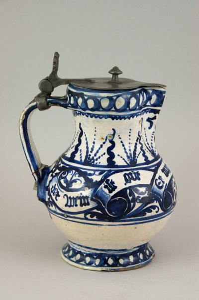 The bowl of the dish is divided into bands by painted decoration. The base and the neck have decorative circles the broad middle band is decorated with an inscribed twisted scroll in a floral-leaved field. The inscription reads as follows: DER WEIN IST GUT ER MACH(T) MANKHEN GÜLN MUT.