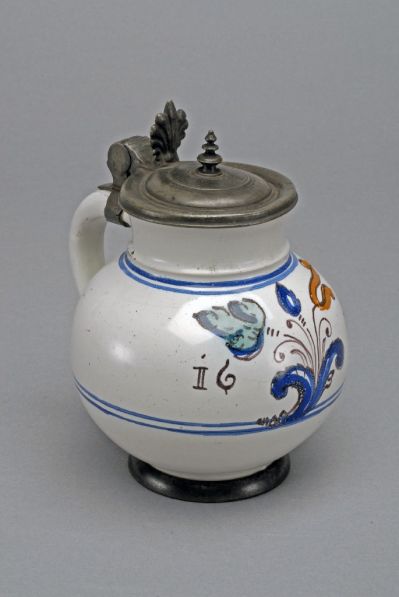 The spherical jug stands on a narrow tin-set base. The neck is cylindrical, and there is a curving handle. The turning pewter lid has a palmette knob and a small, added finial. Painted in blue, green and yellow, contoured in manganese, on a white background. Stylized flower stems and the date 1659 appear on the two sides.