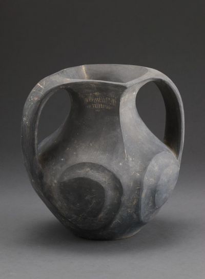 Techniques: | embossed decoration; engraved decoration; hand-shaped; reduction fired; with coiling technique |