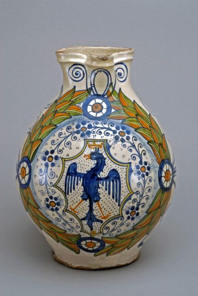 The large egg-shaped bowl stands on a narrow rimmed base and ends in a short neck with lobed rim. The broad flat handle fits to the neck and the body. Painted on an ivory coloured base with a stylized laurel wreath, cut at four places with circles and with the coat of arms of the Montefeltro family, encircled by foliage and flowers. The shield is charged with a blue eagle against the golden dotted background. The eagle is ensigned with a yellow coronet. Twisted ribbons decorate the two sides of the handle they spring form two circular decorations of the laurel wreath.