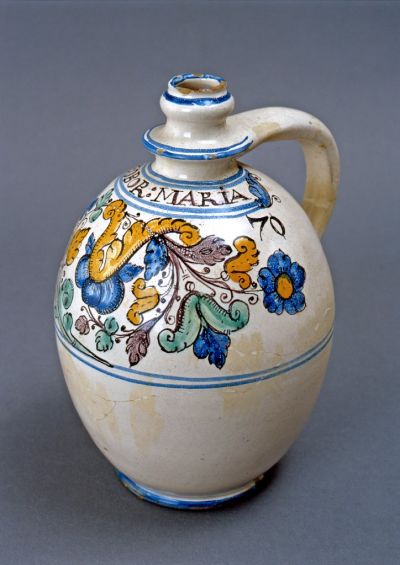 Rimmed base, egg-shaped bowl, slender neck with a narrow pouring lip. The curving handle fits to the bowl and the neck. Decorated with double blue lines on the neck, top and belly. Painted with flowers and foliage in blue, green and yellow, contoured and shaded in manganese. There is an inscription running along the neck G: CZOBOR: MARIA, and the date 1670 on the two sides of the foliage.
