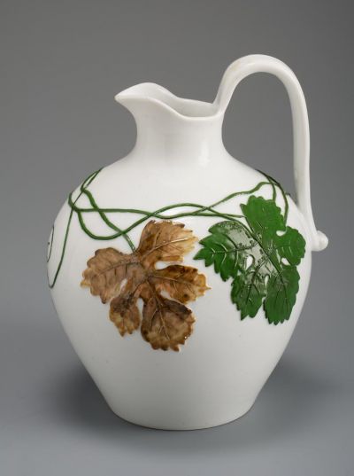 A bulging body with a short, narrow, curved neck. The top rim curves upwards at the spout the carafe is equipped with a ribbon-like, curved, rising handle. The shoulder line is decorated with a relief vine tendril, a blue cluster of grapes and brown and green vine leaves.