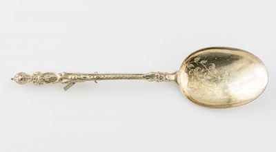 The oval, repoussd ladle is decorated with engraved arabesques. The prismatic handle is curved and joined to the ladle by a leaved knob. Herm finial.