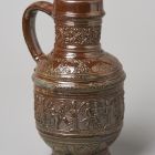 The spherical bowl stands on a round base above wich it is decorated with rope motifs. This line of motifs is followed by alternating transferred lines and rosettes. The middle shows a broad band of stylized arches with columns. There are musicians and dancing couples in the seven arches probably performing six steps of a contemporary dance. The line of inscriptions under the above scenes is illegible. The narrowing top ends in a cylindrical neck here, the alternating motifs of lines and rosettes are followed by transferred ornaments of clovers, lion heads and female masks.