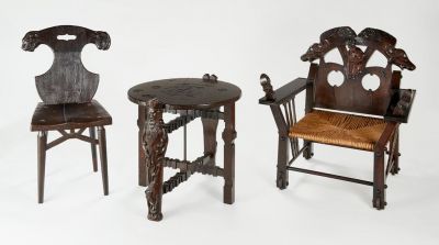 Although Ede Torockai Wigand (1869-1945) originally trained to be a decorative painter, his unquenchable thirst for knowledge led him to try his hand at the most diverse fields of art. It was as a furniture designer, however, that he reaped the highest rewards. His early pieces were inspired by international Art Nouveau, as well as the Arts and Crafts movement from England. Later, he acquired a taste for the forms and decorative motifs of Hungarian folk art, and increasingly turned his attention to the world of fables and fairytales. He spent several years in Transylvania, especially in the part called Székely Land, studying the characteristic features of the local folk-art traditions. His interests and his imagination led to the creation of this rustic set of furniture, which combines traditional Székely carpentry structures with carved figures from folk tales. He designed these pieces for his own home, and a picture of them was included in the book he published in 1916, titled The Decorative Courtyard [Hímes udvar].