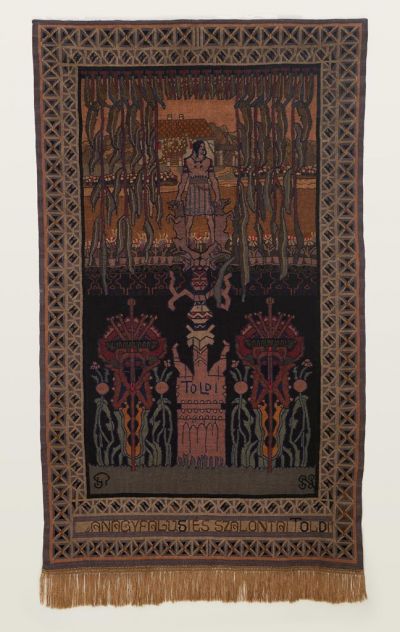 The tapestry consists of a double composition. On the top one, there is a sunny village courtyard with colourful flowers, appearing from behind the curtain constructed of carob-pods. The hero is depicted in his full strength in the front, with the defeated wolves. The bottom picture is a detail of a cemetery, showing in the middle a grave-post inscribed with TOLDI. The tragic contrast between the two scenes is expressed in the colours: the top picture is woven with vivid, light tones, the bottom one with dark, gloomy ones. The picture is framed with a simple border of squares and rhombuses, completed with the following inscription: NAGYFALUSI ÉS SZALON- TAI TOLDI. From 1910, Sándor Nagy made several illustrations to the epic poems of János Arany, including two Toldi-illustrations now in the collection of the Hungarian National Gallery (Inv.Nos. 1933-2121, 1933-2522).