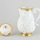 The pear-shaped body stands on a gilt, round, joited and curved foot it has a tipped lip and a handle forming a question mark. Each side is decorated with a relief vine and cluster of grapes. The rim and the lip are lined with gilt decoration. Its domed cover is fitted with an inner rim it is decorated with relief vine foliage, a small gilt finial and a gilt rim. Marked on the bottom in lustre: AR EE ac. its technique of manufacture ranges the pot among the "Böttger-dishes", together with the cup and saucer of identical decoration (IM ltsz.: 5873.a-b.). The outlines of the relief decoration are quite marked the elaborate pattern is not distorted at all by the covering glaze. The shape of the handle enhances the playful silhouette, compensated by a long, squeezed lip on the other side. The bright white colour of the piece is emphasized by the golden lining around the rim of the pot and the cover.