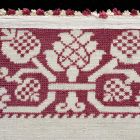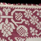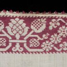 A typical piece of Italian linen embroidery called "Assisi work", and usually made in Umbria. The material and the pattern of such embroidery is beige linen the entire background is blocked out with red silk thread. There are two borders running along the sides with opposing, symmetrical bunches of flowers and pomegranates among the tendril motifs of rosettes. Different variants of this kind of embroidery can be found in most 16th century Italian patterns from the end of the 19th century onwards.
