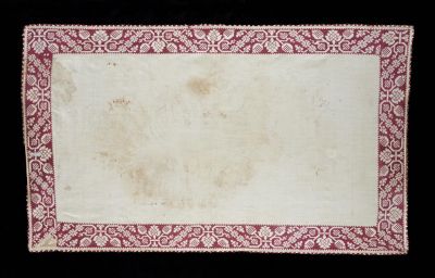 A typical piece of Italian linen embroidery called "Assisi work", and usually made in Umbria. The material and the pattern of such embroidery is beige linen the entire background is blocked out with red silk thread. There are two borders running along the sides with opposing, symmetrical bunches of flowers and pomegranates among the tendril motifs of rosettes. Different variants of this kind of embroidery can be found in most 16th century Italian patterns from the end of the 19th century onwards.