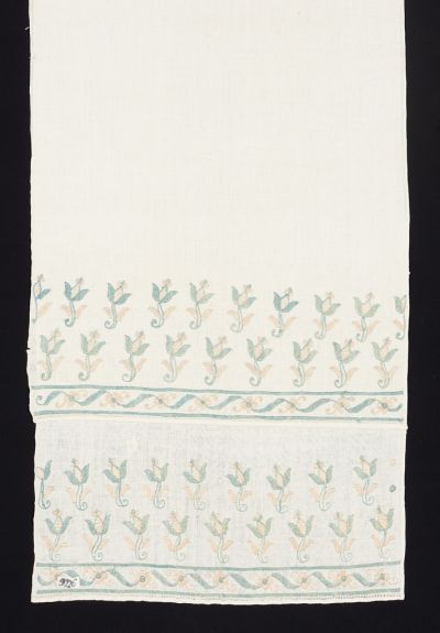 Techniques: | metal thread couched with silk; two-sided satin stitch |