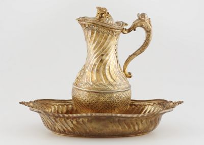The two handles of the oval bowl are shells framed by pairs of volutes with cast foliate ornaments. On the longer sides the curving rim slopes steeply. The same coats-of-arms on both sides: oval shield in a cartouche, in the blue chief two face-like sun- disks surrounded by two five-pointed gold stars. In the gold field of the shield are cheverons. On two sides below are unpainted crickets, and above the lower one a five pointed star. The cup has a circular foot with beaded decoration and fluting. On the lower side of the pear-shaped body is an openwork decoration with wavy ornament. It has a projecting and extending neck with a tapering cover following the line of the spout. It has a shell- shaped finial with naturalistic floral ornaments. The cover has a wavy, fluted edge. The handle has a shell-shaped socket. It has the same coat-of-arms as the bowl. The city’s mark is on the edge of the spout, the illegible master's mark is on the edge of the foot.