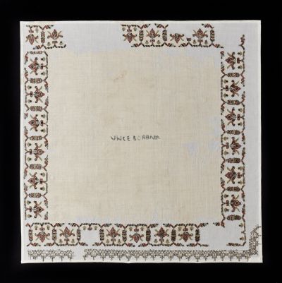As with other Italian embroideries the decoration runs along the sides. There are panels of large-leaved foliage with apposing pomegranates. The gold braided lace on the edge has only partly survived on two sides. In the middle is a rough inscription, VINCE BORBALA, of later origin.