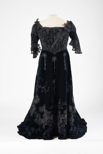 The bodice is stiffened by fish-bones, has a broad, curved décolletage and closes with clasps at the back. The waist-line comes down in a tip at the front. The set-in sleeves are puffed at the shoulders and reach to the elbows. Tulle insets decorate the velvet all round and in V-shape on the sleeves. The tulle is black, trimmed with rows of black pearls and sequins, applied with blue velvet leaves that are enriched with embroidered sequins. The dress is also decorated with volutes and flowers embroidered in sequins. The sleeves are trimmed with tull frills. The skirt reaches the ground, has a tail and is lined by pleated velvet frills. The top shows scattered black sequins, and applied organdie flowers in the centre, with string-of-pearl fringes hanging below. The bottom shows irregular tulle insets, lined by curved rows of sequins and chenille yarn and embroidered with flowery boughs of sequins and pearls.