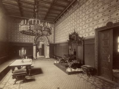 Exhibition photograph - a royal reception hall with a throne platform in the building of the historic main group of the Millennial Exhibition