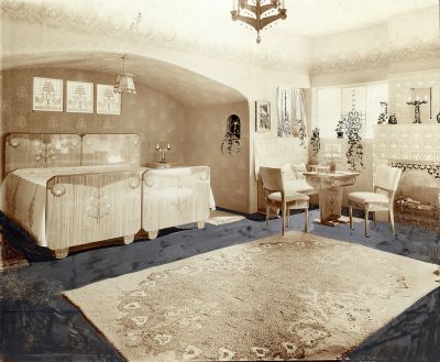 Exhibition photograph - bedroom furniture designed by Béla Löffler, Spring Exhibition of The Association of Applied Arts 1907