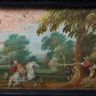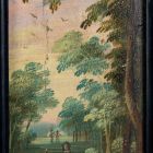 The horizontal prismatic cabinet has two doors. In the coffin-shaped closing part is a small casket with a convertible cover. On the interior of the two doors' inlays, on the ten little end faces of the drawers and the two outside inlays of the convertible cover are painted hunting scenes and landscapes with staffage figures. In the middle is a niche with a back wall mirror on the bottom is a floor covering made of dark and light squares, which produces an effect of perspective.