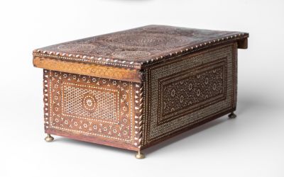 Stands on four small copper feet. The outer surface and both sides of the cover are decorated with a concentric, starry intarsia in a rectangular field. The cover could once be removed the inner side shows a large lozenge in a circle in the middle, elaborated with fan motifs. On the sides, the lozenge motif also appears in the corners, although between rosettes. Companion pieces can be found in the Victoria and Albert Museum in London, in the Rijksmuseum, Amsterdam, in the St. Petersburg Hermitage and in the Muzej za umjetnost iobrt collection in Zagreb. The piece described above is thought to be of Spanish origin by Batári, oh the basis of the technique of the intarsia however, in view of the analogues, the present writer regards it as more probably originating, from Venice.