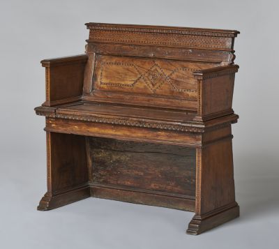 The chest with a folding top seat rests on two hard sides and a hard back. The front edges are decorated with stars, the edges of the seat with carved foliage. The arm rests are two hard panels with inlaid stars. The back is slightly bent, and decorated with plaints of star-intarsia, in a strap-work of prisms, showed in perspective. The top rim has a wood mosaic intarsia of geometrical motifs, surmounted by carved leaves. This mosaic is similar to the intarsia of the stall at Diósgyőr (Avas Calvinist Church, Miskolc).