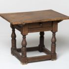 The four baluster-shaped legs are joined by plain stretchers. The frieze hides a drawer with a knob. The cover is rectangular. This type of table was quite common in the cinquecento period it is called a "Bologna table" in literature, named after the place of origin. In Hungarian furniture-making this type was copied and called a table with "Italian legs". Apart from the piece described above there are three similar ones in the collection of the Budapest Museum of Applied Arts (Inv. Nos. 18735, 18393, 18379), all belonging to the Procopius Collection.