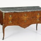 The commode stands on four cabriole legs mounted at the knee with scrolled acanthus leaves and shod with lion's feet of gilt bronze. The chest of two drawers is rounded at the front corners, and decorated with inlaid flutes and bronze garlands. The bottom part of the front panel shows lambrequin decoration. On the drawer panels, there are fields framed by stringing a large one in the middle and small ones on the two sides. The side fields show inlaid vases, while the middle one is decorated with musical instruments and scores, among leaved boughs. The drawers are equipped with two wreathed bronze pulls on the sides and a bronze keyhole shield of ribbon and leaf motifs, in the middle. Below the curved marble top, on the front right corner there is an inscription of 5-6 mm: JME (Jurés Maitres Ébenistes) P ROUSSEL.