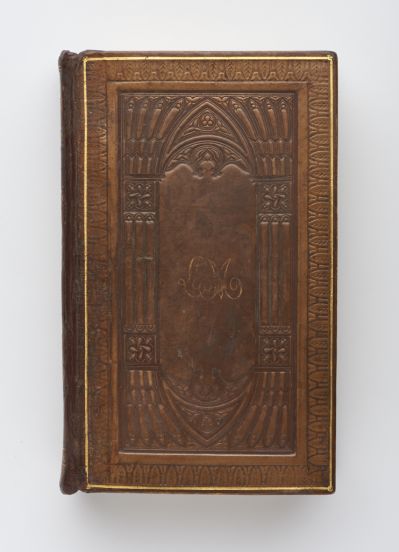 Bound in brown leather, the decoration of the front and back plates is identical: palmette line tooled in blind in a gilt line frame. The surface is enclosed by lines tooled in blind the a la cathedral decoration is symmetrical to the central axis. The middle ogee compartment is surrounded by similar, though smaller compartments, with a rosette in a square below each. A close analogy of this bookbinding is published in H. Helwig: Handbuch der Einbandkunde, Vol. I, Hamburg 1953, p. 192, pict.120. The plain middle field shows the LM initials, hand gift. The spine is divided into six compartments by gilt stripes of lozenges and tiny motifs. The second bears the title inscription: Paroissien, the others are enriched with arabesque and scrolls. The leather frame of the French-style, leather-jointed endpaper frame is gilt, the surface is made of green, red, yellow and blue-veined marbled paper. The tool is gilt, the headband is new, sewn of green and gray silk thread. There is a merchant note stacked to the inside, with Librairie de L.F. Legendre, Rue des deux Ponts No26, lie St Louis, Abt. de lecture Salon littérre. The inner side of the endpaper also has an ex libris Pető Andorné stuck in, marked with F.K. The cover plate shows the copper engraving of Mary-Magdalene: La Magdeleine au pied de la croix. This, and the other five engravings illustrating the text, are unmarked.